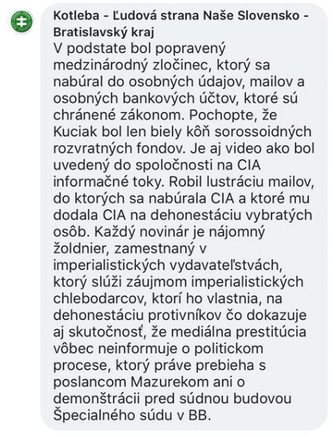 Svoje taktiež hovorí aj tento komentár, ktorý na svojom Facebooku uverejnila Kotleba – Ľudová strana Naše Slovensko – Bratislavský kraj krátko po vražde Jána Kuciaka.